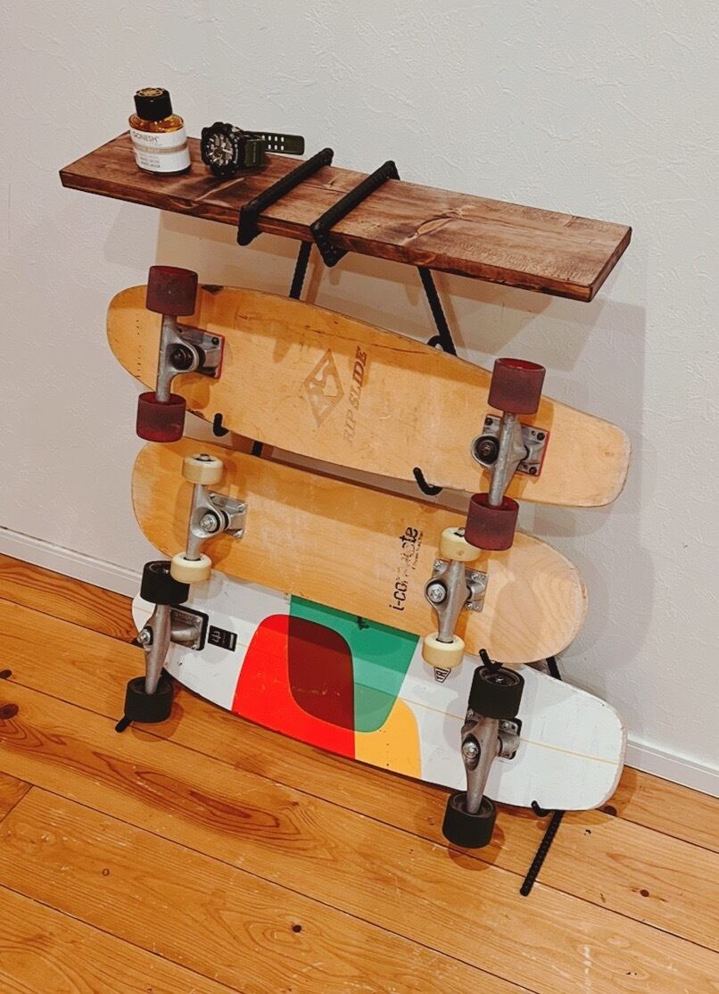 スケボーを綺麗に収納できるだけでなく天端に小物を置けるように設計しました。